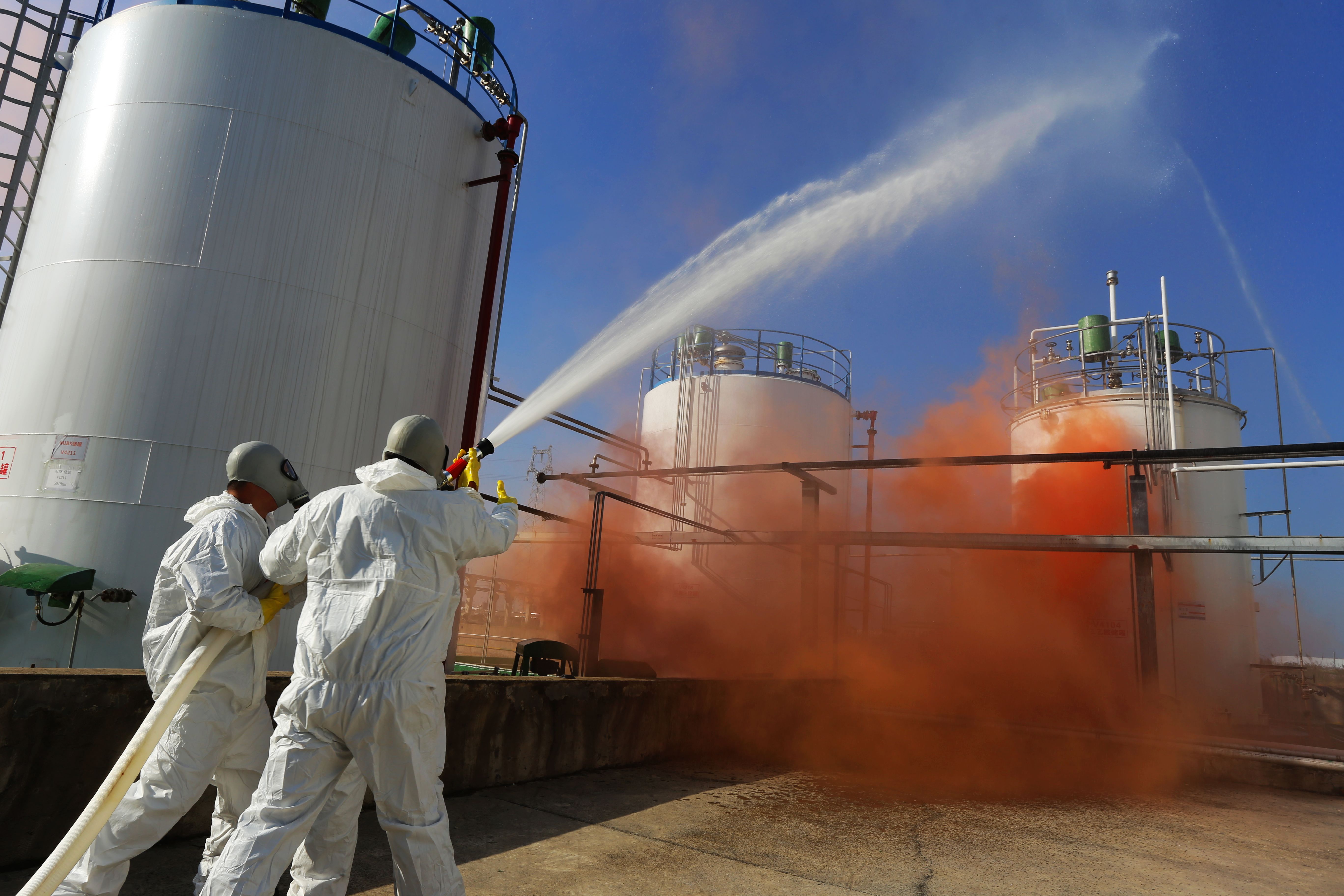随着总指挥一声令下,演练开始。此次演练是模拟甲乙类罐区三乙胺储罐阀门法兰垫子坏损,三乙胺大量泄漏事件。调度员报警后,立即启动公司级应急预案,消防分队、抢险抢修分队、警戒疏散分队、污染控制环境监测等7个应急救援分队奔赴现场。抢险抢修分队穿戴防化服进行实地勘查,堵住事故现场的泄漏点,进行快速洗消处置。经过40分钟紧急处置,三乙胺泄漏得到有效控制,此次环境突发事件处置演练顺利完成。