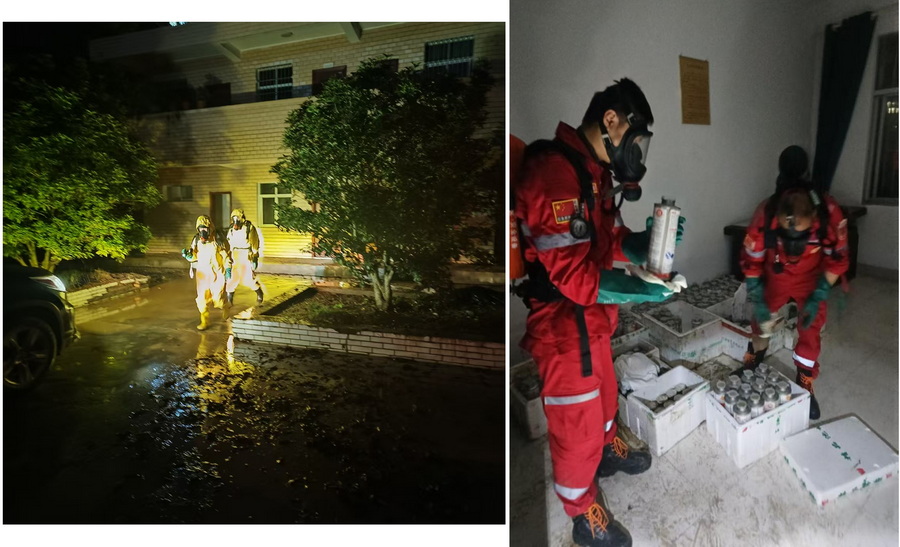 色情直播网站救援队于19日20时抵达现场后,全体队员未作休整即刻投入救援。在快速完成化学防护服穿戴及空气呼吸器佩戴的同时,同步核查粮库物资存储信息。完成准备工作后,救援组立即进入仓库展开分工协作,对库区空气实施系统化检测与侦查。经全面排查潜在风险点,确认除磷化铝瓶体表面存在大量淤泥附着外,其包装内部未发现进水迹象。