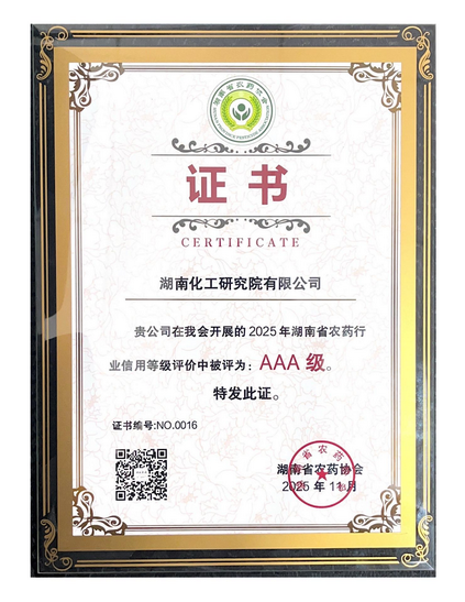 近日,由省农业农村厅指导、省农药协会组织开展的2025年度湖南省农药行业信用等级评价结果正式公布。湖南化工研究院有限公司凭借长期坚守诚信经营理念、完善的信用管理体系及突出的行业贡献,从参评企业中脱颖而出,获评“AAA级经营企业”。该等级为湖南省农药行业信用评价最高荣誉,标志着湖南化工研究院在行业信用建设、履约能力及社会责任践行等方面处于省内领先行列。